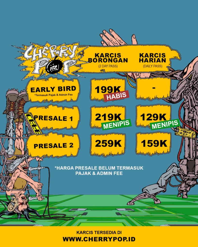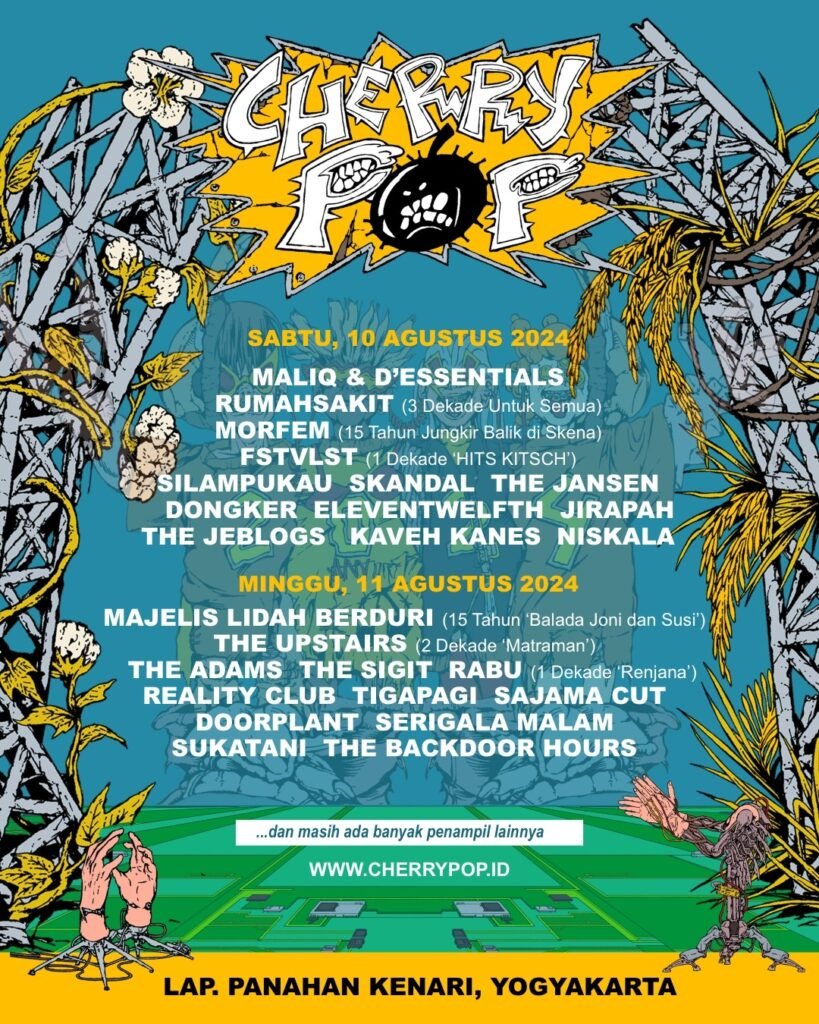 Cherrypop 2024 kembali menghadirkan tiga panggung musik selama dua hari, yang akan diisi oleh puluhan penampil dari beberapa genre, dari emerging band yang baru muncul ke permukaan hingga band era 90-an yang masih eksis hingga saat ini. ”Kita coba menampilkan band yang lebih beragam genre-nya dengan lintas segmen generasi pendengar dan juga beberapa spesial set perayaan sesuai tema tahun ini,” kata Ahmad Sobirin, Director of Festival Cherrypop 2024.