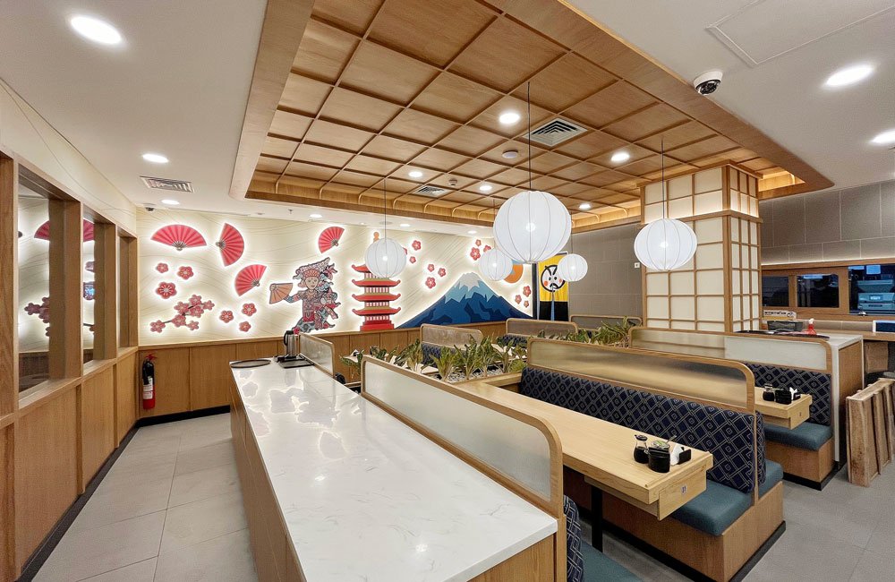 Desain gerainya merupakan peleburan gaya desain modern Jepang dengan sentuhan nuansa Bali yang artistik. Gerai Genki Sushi Icon Bali Mall merupakan peleburan antara gaya desain modern Jepang dengan sentuhan nuansa Bali yang artistik. Konsep material pada desain interiornya juga menggunakan bahan-bahan natural yang tentunya tetap akan mengutamakan kenyamanan pelanggannya sambil memberikan pengalaman menyantap hidangan Jepang nan autentik dengan pengalaman yang berbeda dengan menu-menunya yang inovatif. Jangan lupa juga untuk mencoba menu “Trip to Okinawa”, menu bernuansa laut dan pantai yang cocok dinikmati di Bali yang senada dengan nuansa area Okinawa.