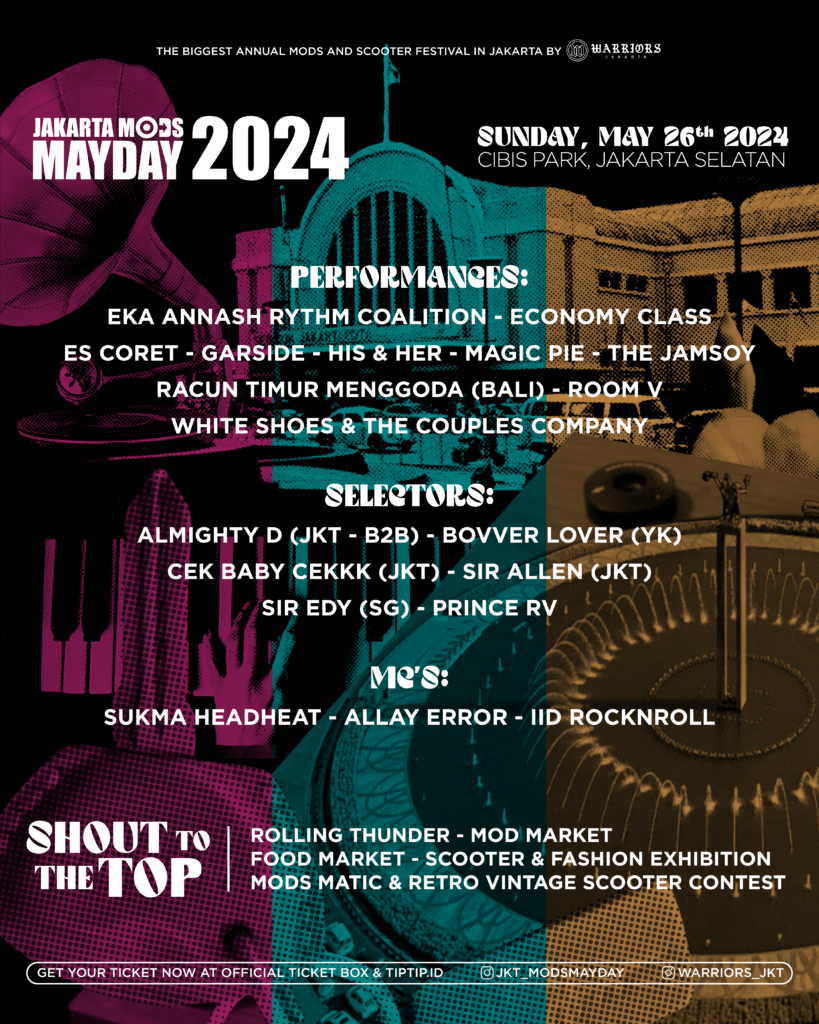 Membawa tema SHOUT OUT TO THE TOP tahun ini JAKARTA MODS MAYDAY diambil dari lagu The Style Council yang menggaungkan periuangan menuiu puncak kebahagiaan Sebagai lebarannya para kelas pekeria para penqgemar budaya MODS ini untuk meramaikan JAKARTA MODS MAYDAY 2024.