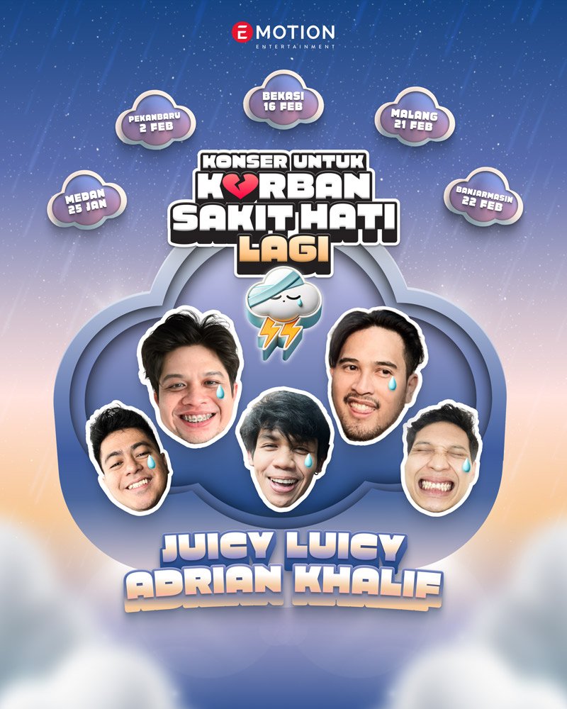 Kabar ini dilanjutkan dengan munculnya berita dalam bentuk video di beberapa media yang memperlihatkan ikon awan menangis di beberapa kota di Indonesia pada Selasa, 12 November 2024 lalu. Ikon awan menangis yang dikenali sebagai ikon Konser Untuk Korban Sakit Hati itu terlihat di langit Masjid Raya Medan, Tugu Zapin di Pekanbaru, Piramida T erbalik Summarecon Bekasi, Alun-alun Kota Malang, dan Patung Bekantan di Banjarmasin. Lewat akun Instagram resminya, Konser Untuk Korban Sakit Hati Lagi mengumumkan bahwa kelima kota tersebut akan menjadi tujuan selanjutnya untuk tur Juicy Luicy dan Adrian Khalif di tahun 2025mendatang.