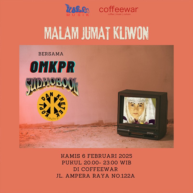 Disambut baik oleh coffeewar serta teman teman orkes dalam sebuah program musik bertajuk “malam jumat kliwon” yang akan diselenggarakan setiap bulan pada hari kamis malam jumat kliwon (mengikuti kalender jawa) akan dimeriahkan dengan 3 grup musik dibalut dalam rasa orkes melayu dengan set nikmat intim dan menggelitik, acara akan dimulai pada pukul 20.00 WIB sampai selesai di Coffeewar Jl. Ampera Raya No.122A JAKARTA SELATAN