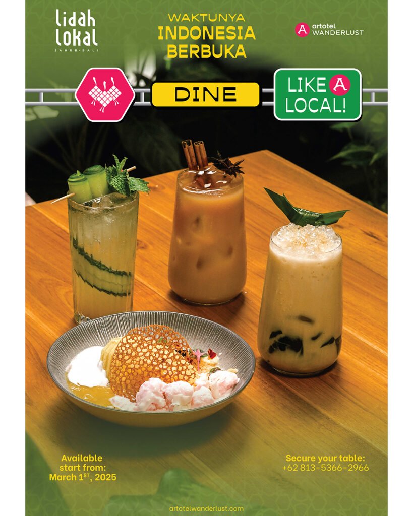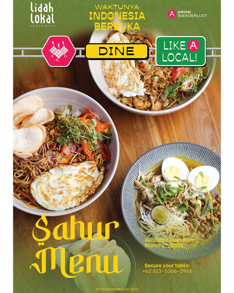 Untuk program F&B, ARTOTEL Sanur – Bali sudah menyiapkan promo Dine Like A Local dengan pilihan sajian sahur, takjil, dan paket berbuka untuk keluarga yang dapat dinikmati di Lidah Lokal Sanur Restoran, dimulai dengan harga Rp. 40,000,-. Pilihan menu sahur antara lain Nasi Goreng Ayam, Mie Goreng Ayam, dan Bubur Ayam. Menu ini dapat dinikmati sepanjang bulan Ramadan mulai pukul 03.00 WITA hingga pukul 06.00 WITA. Menu takjil untuk berbuka puasa antara lain Es Daluman, Mangga Ketan Hitam, Es Timun Markisa, dan Thai Aromatic Teh, yang dapat dinikmati dari pukul 18.30 – 22.30 WITA. Sedangkan untuk sajian buka puasa, kami menghadirkan family style paket untuk 4 pax dengan menu beragam seperti Perkedel Jagung, Bakwan Udang, Sate Ayam, Sate Kambing, Plecing Kangkung, Tumis Toge, dan masih banyak lagi. Penwaran ini dapat dinikmati dengan harga Rp. 600,000,- Untuk informasi dan pemesanan dapat melalui +62 813 5366 2966.