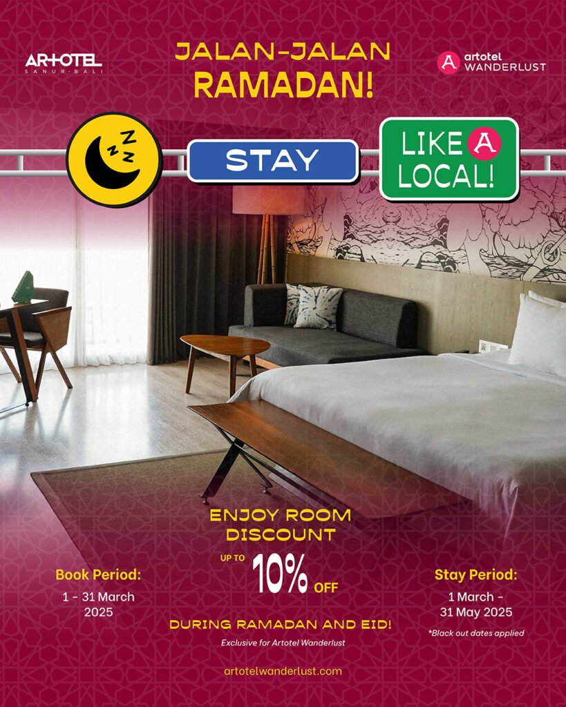 Selama bulan Ramadan, ARTOTEL Sanur – Bali menghadirkan promosi menginap Jalan Jalan Ramadan – Stay Like A Local dimana para tamu mendapatkan potongan harga menginap sebesar 5% untuk non member dan 10% member Artotel Wanderlust sudah termasuk dengan sarapan untuk dua orang. Adapun periode pemesanan dimulai dari sekarang dan periode menginap tersedia di tanggal 1 Maret sampai 31 Mei 2025.