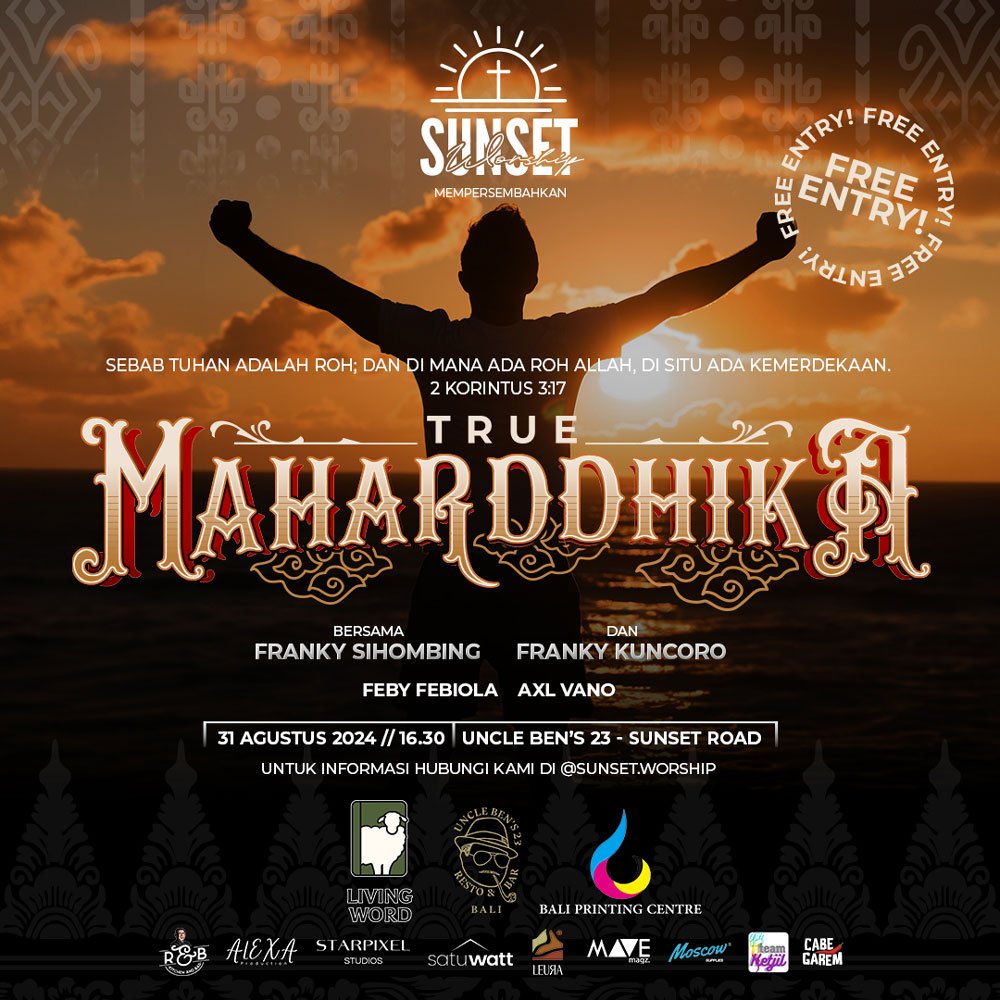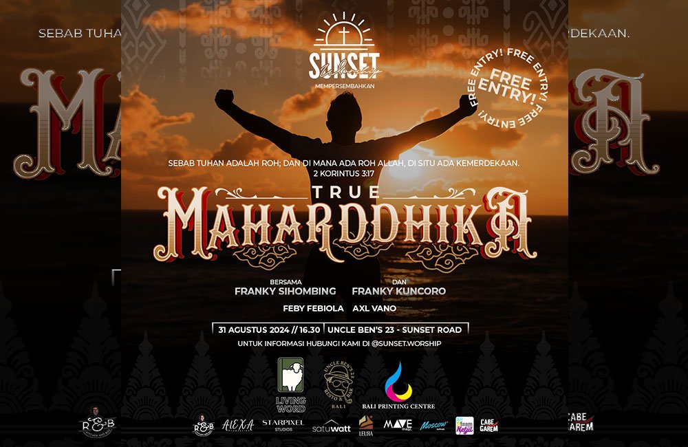 True Maharddhika diramaikan oleh Franky Sihombing, Franky Kuncoro, Feby Febiola dan Axl Vano dari Midnite Worship Project. Bertempat di Uncle Ben’s 23 Jl. Sunset Road 135 pukul 16.30 tanggal 31 Agustus 2024.