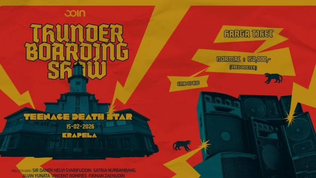 Unit musik Teenage Death Star (TDS) siap kembali mengacak-acak panggung lewat pertunjukan bertajuk “Thunder Boarding Show” pada 15 Februari 2026 mendatang. Berlokasi di Krapela, Jakarta Selatan, konser ini menjadi edisi kedua setelah sebelumnya sukses diperkenalkan di skala festival.