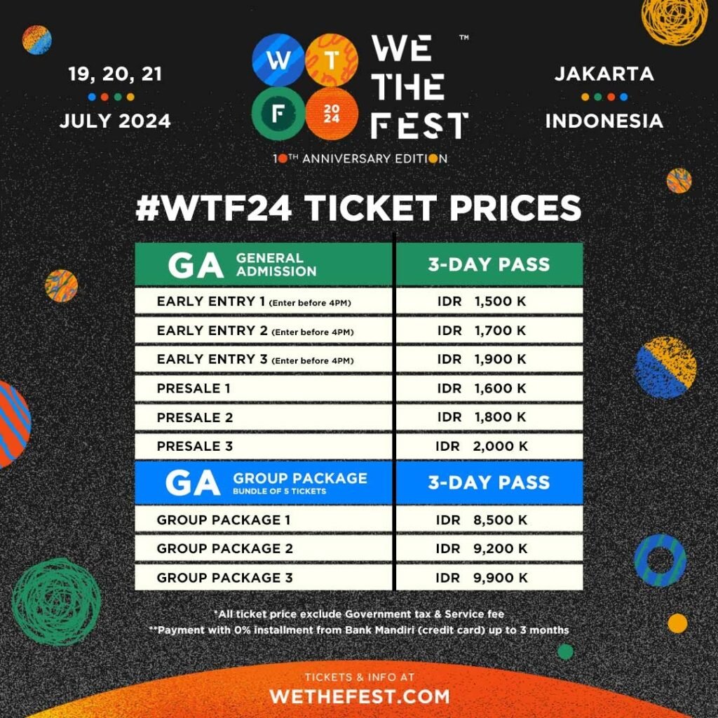 Untuk pengunjung yang ingin menyaksikan #WTF24 selama tiga hari dapat juga membeli tiket dengan jenis GA 3-day pass atau VIB 3-day pass. Harga tiket belum termasuk pajak dan harga akan terus di update.